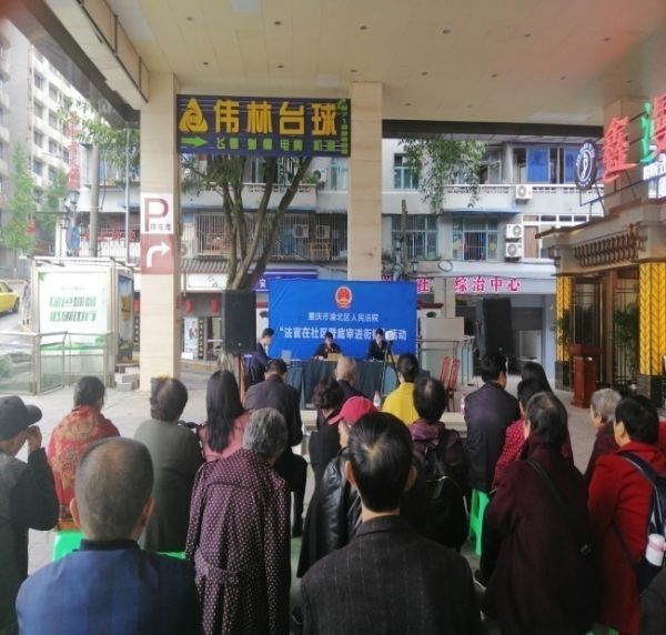 2019年10月31日一大早,渝北法院民二庭李旻昊法官一行即来到了渝北区两路街道义学路社区摆开了摊、搭好了架,为即将进行的“法官在社区暨庭审进街镇” 活动开展准备工作。庭审还未开始,周边的群众就纷纷聚拢来,好奇地打量着庭审现场。执行局的法治宣传员趁此机会将带来的宣传资料一一分发给围观群众,旁边摆放的渝北法院扫黑除恶宣传资料板也吸引了不少群众驻足。