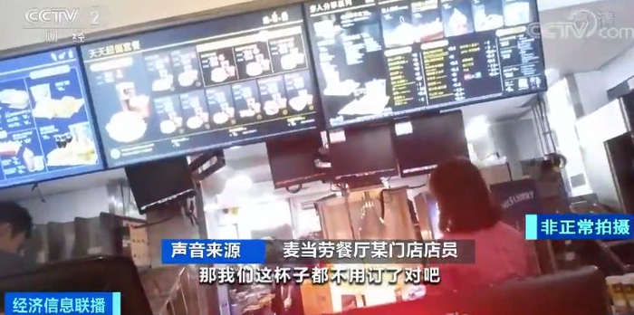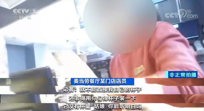 麦当劳餐厅某门店店员:如果每个人来了都跟我们这么说,我们这杯子都不用订了,对吧?肯定到哪有哪的标准,我们有我们的标准。我们的售卖机制就是这样的,就要使用我们的杯子。