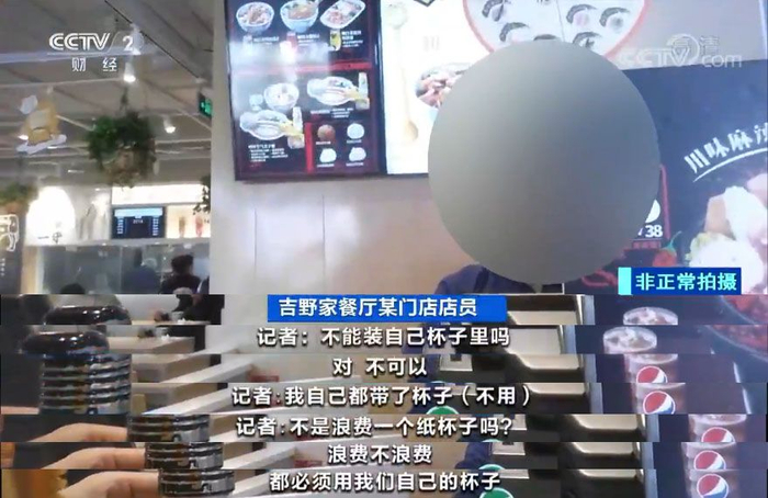 记者来到一家连锁餐厅,点了一份牛肉饭套餐,其中有一杯饮品,当记者询问是否可以使用自己的杯子时遭到了拒绝。