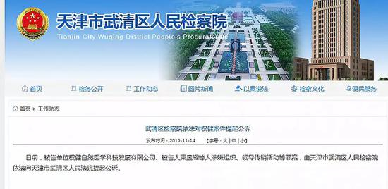 11月14日,天津市武清区人民检察院官网发布公告,“日前,被告单位权健自然医学科技发展有限公司、被告人束昱辉等人涉嫌组织、领导传销活动等罪案,由天津市武清区人民检察院依法向天津市武清区人民法院提起公诉。”