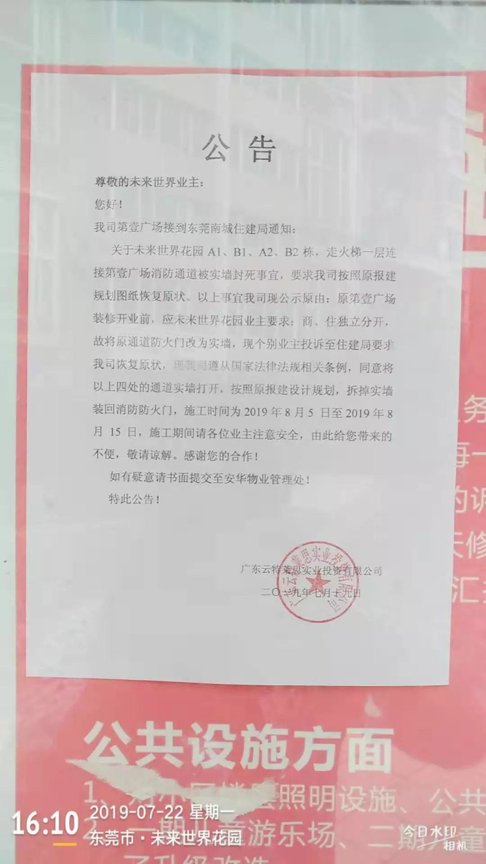 华海物业回应称,已经按业主和住建局的要求,同意拆掉商场的石墙恢复防火门。7月19日在小区公示栏进行了公示,公示显示施工时间为8月5日至8月15日。