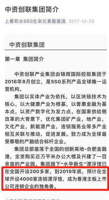 此前,名为“上善若水SSG生命元素能量液”微信公众号曾对中资创联公司有过介绍,中资创联产业集团由锦辉国际控股集团于2016年8月创立,是SSG系列产品全球唯一运营机构。集团总部座落于全国的创新高地-合肥金融港,全资购买近万平米办公大楼及兴建了一百余亩的产业园。集团旗下“水孕新生”漂浮馆已在全国开设200多家,到2019年底,预计在全球开设4000家连锁漂浮馆,成为香港主板上市公司连锁企业的独角兽。