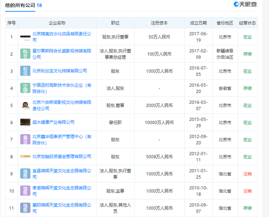 而许嫦容实际控制18家公司,除了上述的锦辉国际控股集团有限公司,还涉及影视、化妆品、金融等领域企业。