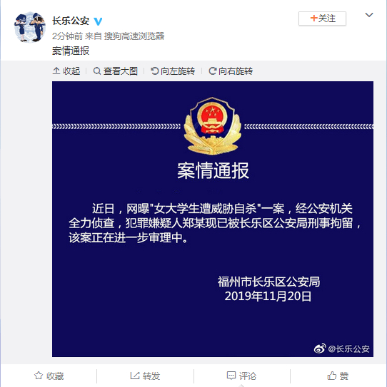近日,网曝“女大学生遭威胁自杀”一案,经公安机关全力侦查,犯罪嫌疑人郑某现已被长乐区公安局刑事拘留,该案正在进一步审理中。