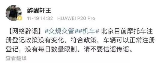 此外,北京市交管局涉车队的程烨警官也在其个人微博表示,目前摩托车登记政策没有改变。