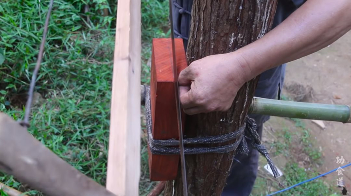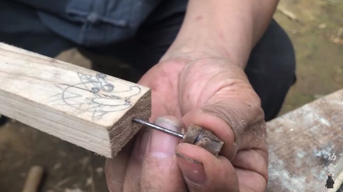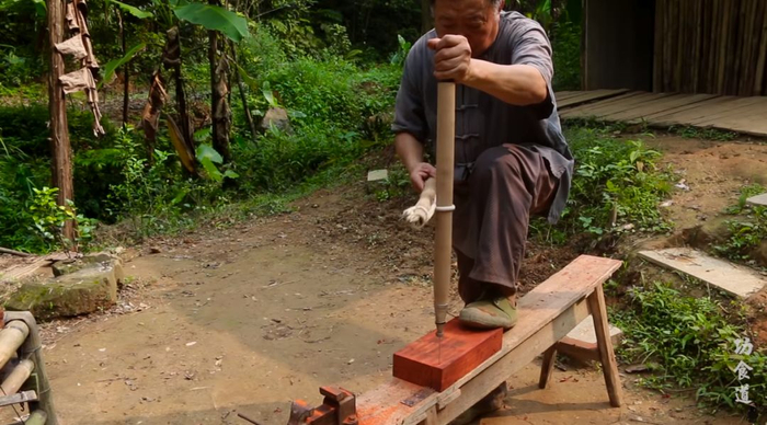 视频里看不到什么现代工具的痕迹,工具都是最原始的,像是这个打孔的“舞钻”。