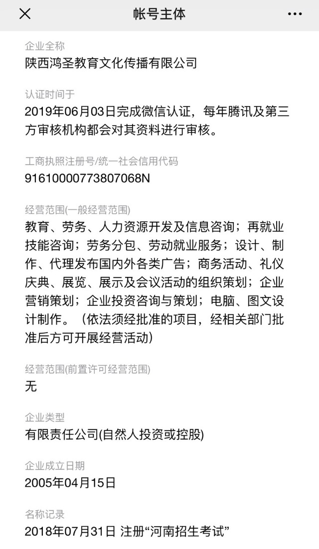 调查中,记者发现这样的困惑并不鲜见。以“河南招生考试”为例,在公众号搜索框里输入上述关键词后,列表中赫然出现与之完全同名的公众号,且标注已认证加“V”。点击“更多资料”,却显示账号主体并非河南省招生办公室等官方机构,而是陕西鸿圣教育文化传播有限公司。