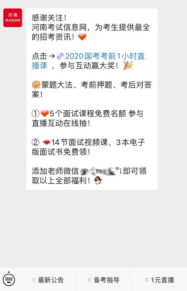 关注该公众号,自动回复的消息打出赤裸裸的广告:“点击2020国考考前1小时直播课,参与互动赢大奖!蒙题大法、考前押题、考后对答案!”之后,又给出老师微信号,号称添加后可领取福利。