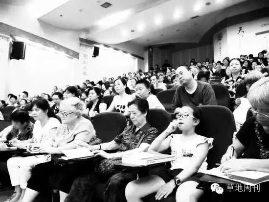 7月4日这一场,下午两点刚过,报告厅300个座位满满当当。听众有六七岁的稚童,挺着啤酒肚的中年汉子,靓丽时髦的女郎,以及头戴白帽的回族老者……流沙河入场时,已有听众坐在过道上,来得更晚一些的,甚至坐在讲台的台阶上,侧着身子扭头听讲。一位听众对《新华每日电讯》记者说,上个月她还见过身穿环卫工人制服的听众。