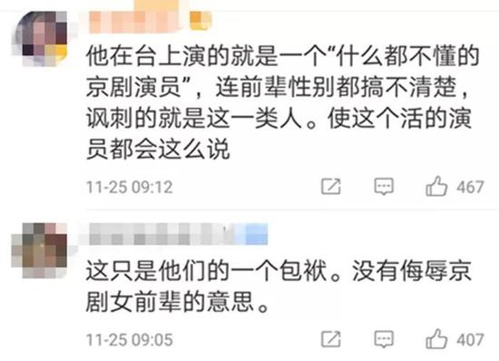 也有网友为张云雷分辩,认为“这只是他们的一个包袱。没有侮辱京剧女前辈的意思。”还有网友称,这段相声刻画的人物就是讽刺一个不懂京剧的人装懂,和别人吹牛,跟京剧名家都熟。