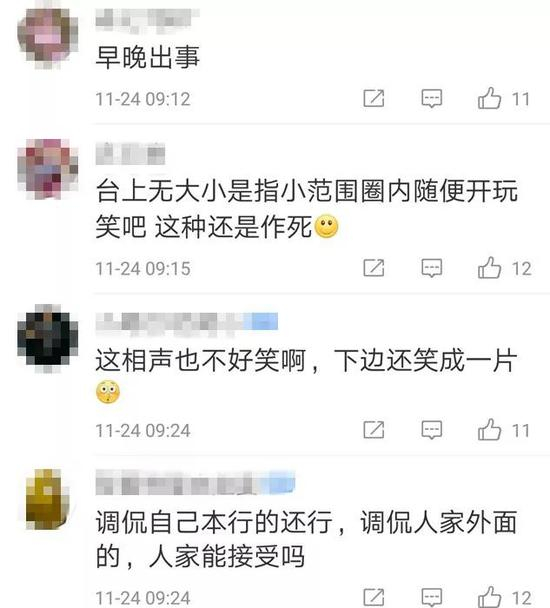 上述视频曝光后,引发网友争论。有人痛批张云雷“恶俗”,“真心不能接受这样的调侃”,认为即便是在台上说相声的时候,也应该对前辈有最起码的尊重,不能口无遮拦。