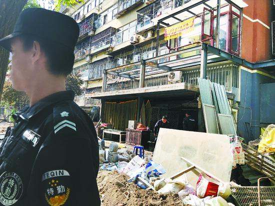 当大型机械向4号楼最东侧靠近时,在旁边围观的业主邓某突然情绪失控,大喊大叫,“下面是空的,危险”“不要靠近”……并冲上去阻拦推土机继续前进。两名街道保安见此情况,赶忙抱住邓某,以免受伤。