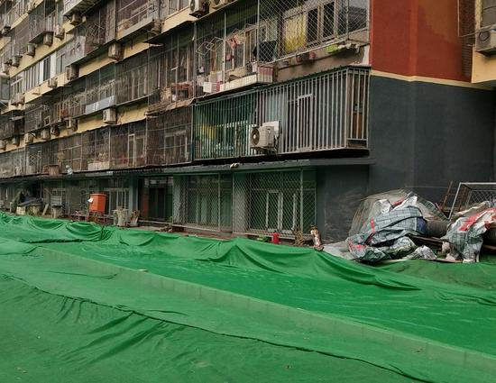 原来,一年半以前,4号楼南侧这片用苫布覆盖的位置还是绿化带,因为其中存在违法建筑,西城区白纸坊街道于去年5月4日调来了推土机准备拆除。