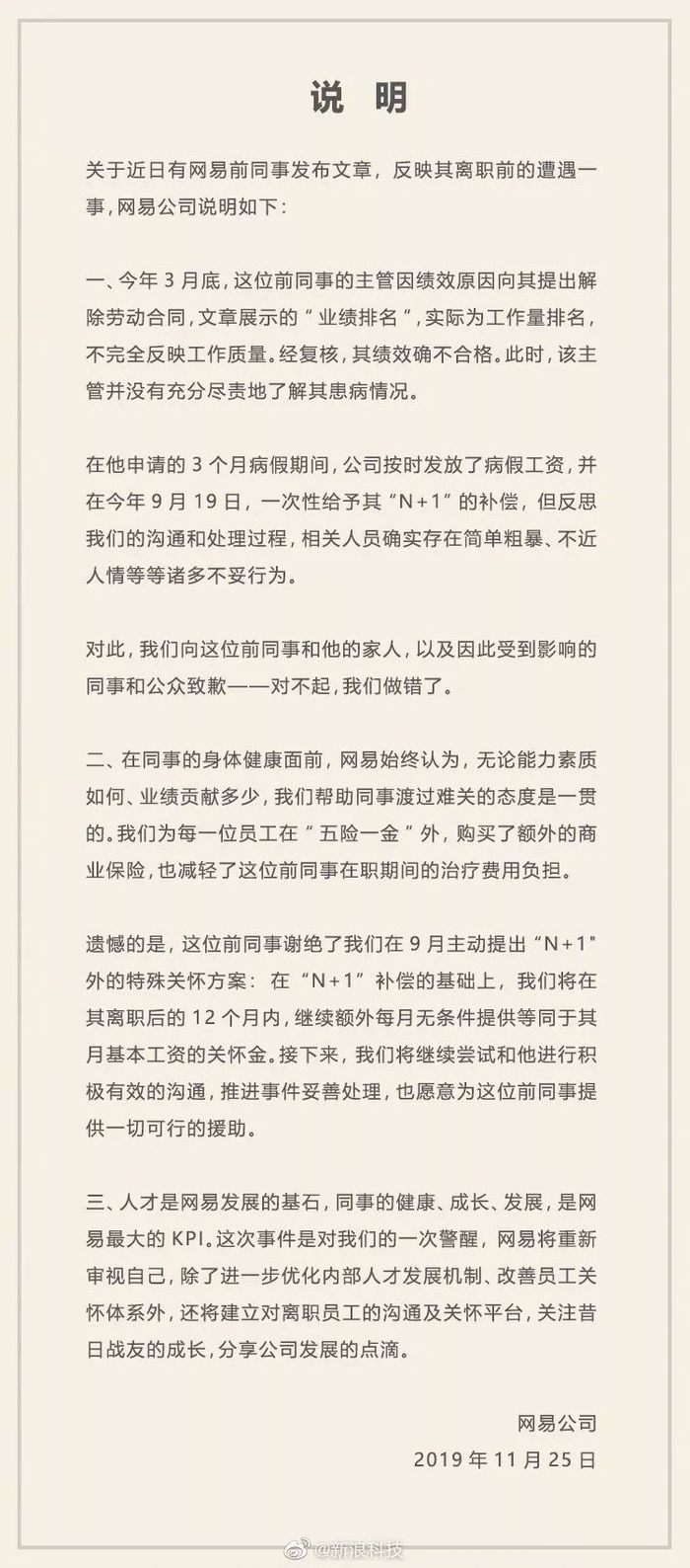 25日上午,网易发声明称,承认确实存在简单粗暴、不近人情等诸多行为,向相关前同事及家人道歉。同日,网易向全体员工发布内部说明,对长达8个月的时间线进行了梳理,以“给当事人、社会各界以及网易员工一个交代”。
