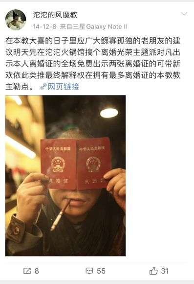 火锅馆开业后,这里不仅仅成为了粉丝们朝拜的“圣地”,还是沱沱呼朋伴友、把酒言欢的“天堂”。2014年12月9日,沱沱火锅馆里举行了一场盛大的“离婚光荣主题派对”,“凡出示本人离婚证的全场免费,出示两张离婚证的可带新欢,依此类推,最终解释权在拥有最多离婚证的本教教主勒点。”微博上,沱沱手举两张离婚证昭告朋友,他称那天为“本教大喜的日子”。