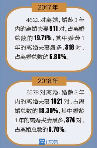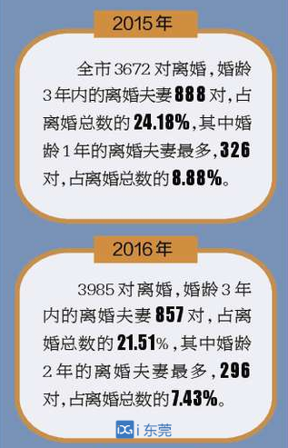 都说婚姻有“七年之痒”,可婚龄三年内夫妻逐步上升的离婚率也不容忽视。来自市民政局的数据显示,近年来,东莞夫妻中婚龄1年的夫妻离婚率最高。