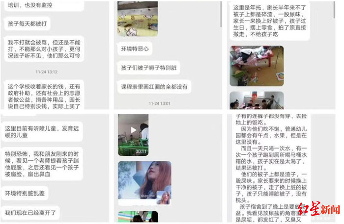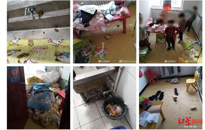 在网友附带的一张图片上红星新闻记者看到,一间教室里6名儿童站在一张桌子旁,桌上杂乱地堆放着衣服、水壶、图书等。画架、儿童座椅、儿童图书和各种废纸在房间里杂乱放置。一条窗帘从窗子中间垂下。另一张图片里,一个教室里杂乱堆放了各种印有卡通图案的儿童被褥,而且有的被褥上有明显脏痕。还有一张图片中,一间教室中央的地面上甚至还有儿童粪便。上述微博和图片在微博大量流传,引发网友热议和转发。在另一张图片中一名成年女性老师坐在一名儿童身上,图中儿童表情痛苦。