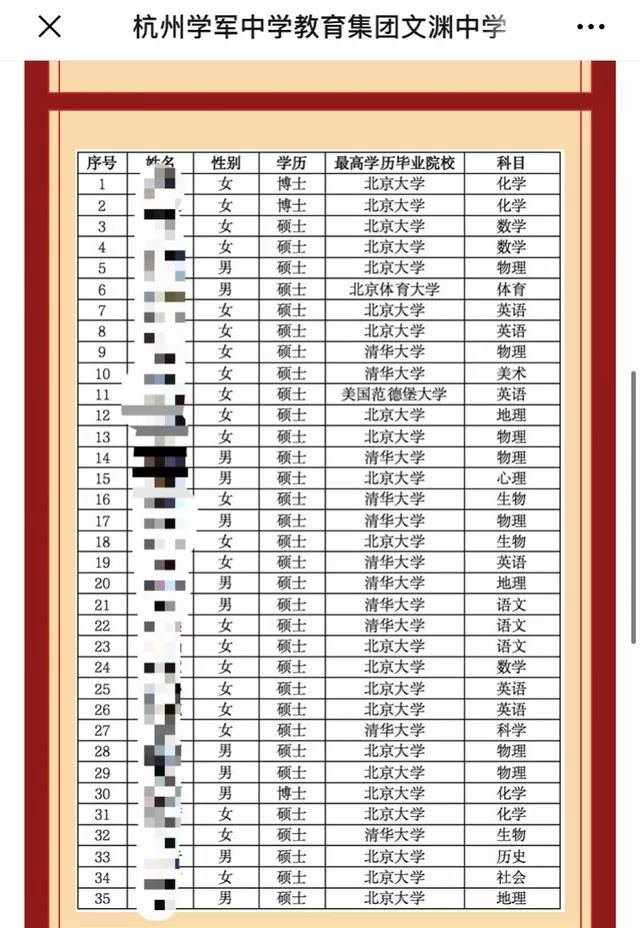 这份教师招聘拟录用人员名单显示,35人中毕业于北京大学有22人,毕业于清华大学的11人,毕业于北京体育大学的1人,毕业于美国范德堡大学的1人。此外,35人中,32人为硕士,3人为博士。应聘人员均经过笔试、专业和综合面试等考核环节,录用岗位包括语文、数学、外语、心理、社会等多个科目。