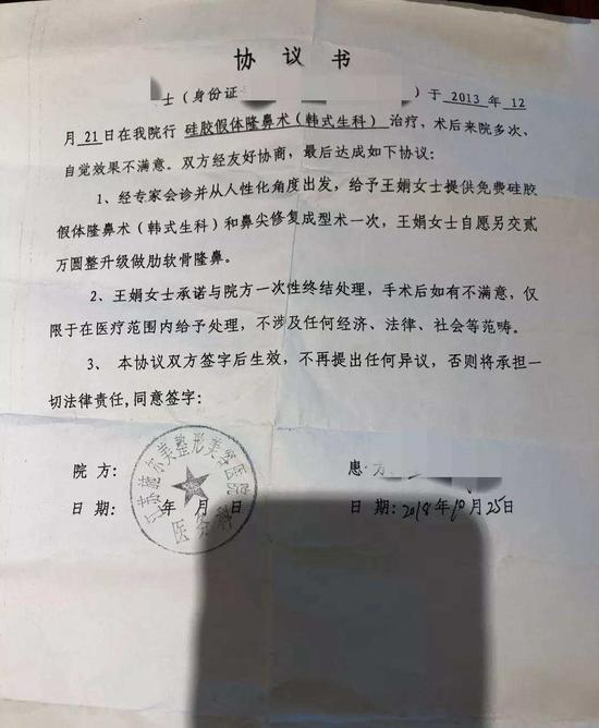 王女士接受了这个方案并交了两万元费用。不过这一次施而美还让王女士签下一份“协议书”,内容包括:“自愿另交贰万元升级做肋软骨隆鼻。。。。。。手术后如有不满意,仅限于在医疗范围内给予处理,不涉及任何经济、法律、社会等范畴。”