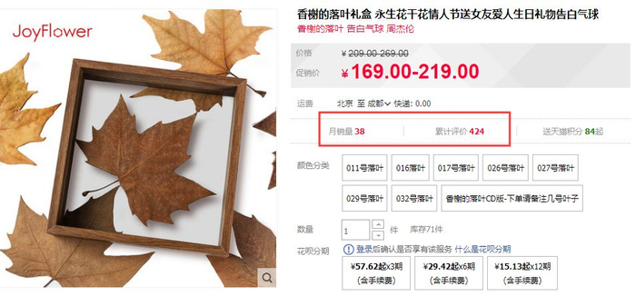 按照销量从高到底排列,销量最高的一款落叶礼盒月销量38个,累计评价424条。