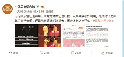 苗阜也被张云雷的粉丝牵扯进去,被指责的段子来自于2011年。于是,中国历史研究院的官方微博发了这样一段文字:“无论张云雷还是苗阜,究竟是调侃还是诋毁,人民群众心如明镜。是领时代之风貌的曲艺大师,还是狺狺狂吠的跳梁者,历史终将做出评价。”