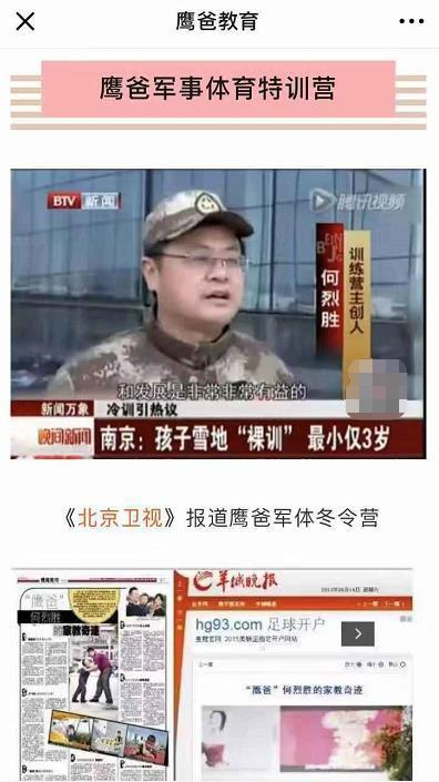 北青报记者从“鹰爸教育” 官方微信公众号中发现,今年暑假,何烈胜的机构仍在招收夏令营学生。在为期一周的训练期内,学员们会进行生活自理、体能品格、感恩分享、军旅体验等多种训练,每期收费3980元/人。