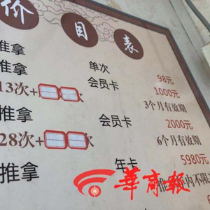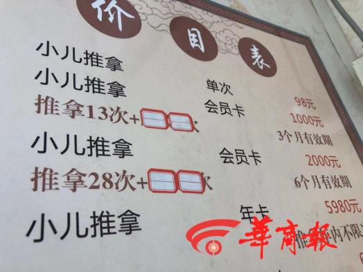 该店价目表显示,单次推拿118元每次,10次推拿卡880元(有效期1年),20次推拿卡1600元,(有效期1年)……