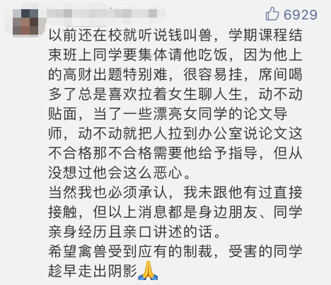 在公众号“莫愁江湖”相关举报信的评论区,有不少留言指出,钱逢胜此前就疑似有性骚扰学生的行为。