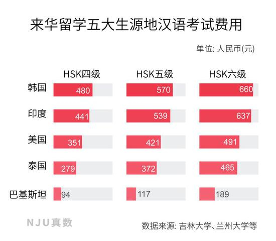 根据吉林大学、兰州大学公布的汉语水平考试收费标准,在来华留学五大生源地中,韩国考生参加汉语水平考试HSK四级考试,费用为480元,巴基斯坦考生仅为94.5元。