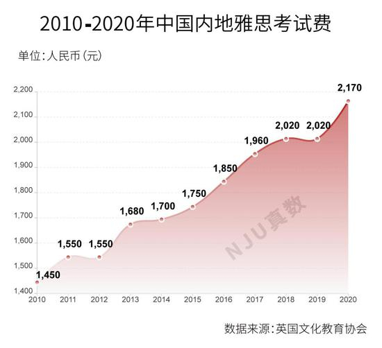 从2010年到2020年,雅思考试费用一路上涨,用于留学用途的雅思考试费用从1450元攀升至2170元,平均每年涨72元。