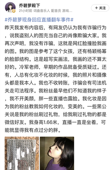 12月9日,“乔碧萝殿下”在微博上发布声明称,“仍有网友仍认为我有诈骗行为,说我盗别人的图充当自己的肖像欺骗大家。我再次声明,我没有诈骗,这就是网红脸撞脸我画的图。我的图是参考了这个女孩,还有杨颖杨幂的脸部结构。这是超写实画法,我画的还不算太好的……我也不收转账,诈骗会有司法机关走司法程序……一些黑公关说是我的粉丝刷过礼物,给我刷过礼物的都是微信好友……”