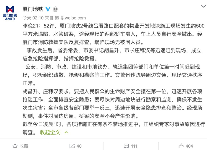 据@厦门地铁消息,12日晚21:52许,厦门地铁2号线吕厝路口配套的物业开发地块施工现场发生约500平方米塌陷,水管破裂,途经现场的两部轿车滑入,车上人员自行安全撤出。经厦门市消防救援支队反复排查,塌陷现场无被困人员。