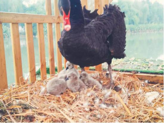 据成都电子科大后勤保障部园林服务中心管护部主任刘佳介绍,在清水河分校建校时,有企业送了学校一对黑天鹅,经过精心养护,目前已经有了11只天鹅。这些天鹅也成为该校的“校宠”,深受同学们的喜爱。“我们在校园的西湖上建了两处天鹅别墅,分别住着两对黑天鹅,新生的4只小天鹅,其父母就是北边别墅的那对黑天鹅。”