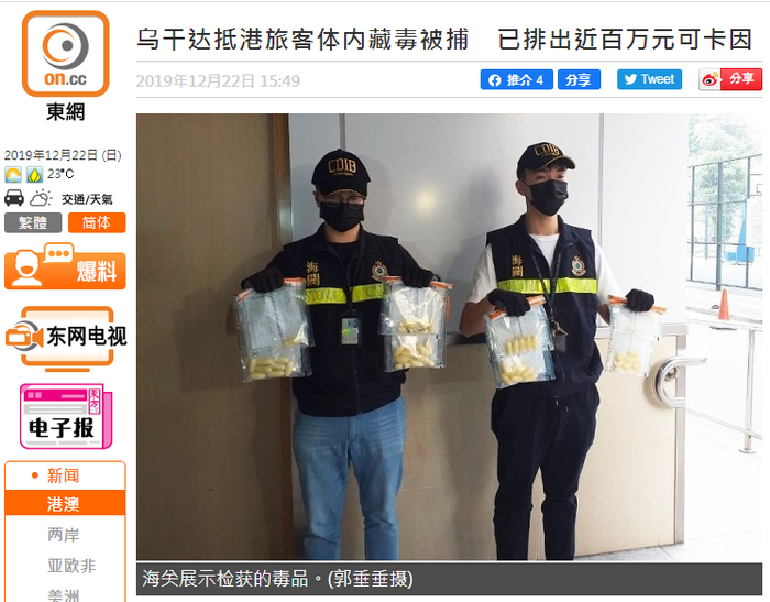 原标题:港媒:男子体内藏毒被香港海关拘捕,已排出近百万元可卡因胶囊