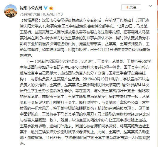 沈阳市公安局提级管辖成立专案组后,在前期工作基础上,现已查清沈阳大学2018级研究生王某宇被故意伤害案件全部事实。12月20日,马某某、王某桥、丛某某等三人因涉嫌故意伤害罪被警方依法刑事拘留。犯罪嫌疑人马某某对其在厮打中持水果刀划伤王某宇的犯罪事实供认不讳,同时供认案发后为不影响学业和前途多次编造虚假供词、掩盖犯罪事实。丛某某、王某桥到案后,主动认错悔过、如实陈述案情,因情节轻微,已于12月21日被依法变更取保候审强制措施。