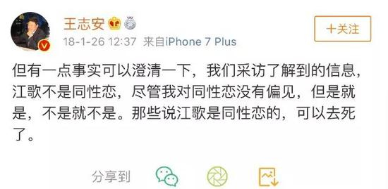 她在微博上传和江歌的合照,以及日常语音对话。她说江歌是同性恋,是自己的“恋人”。王志安曾公开驳斥这一表态,江歌不是同性恋。