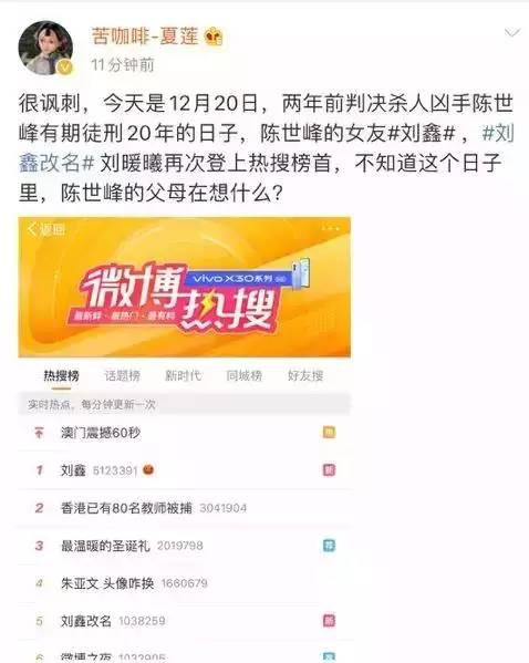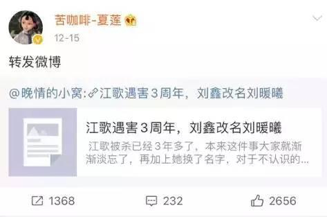 前段时间,江歌妈妈发微博说刘鑫改名字了,改成刘暖曦。