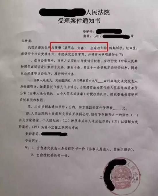 11月3日,江歌妈妈晒出了法院立案通知书。