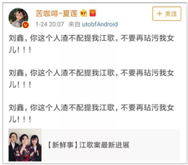 江歌妈妈很快就联系到了刘鑫的父母,但这家人确认刘鑫没事后就走了。抵达日本后,江歌妈妈一直联系不上刘鑫,没有办法的情况下,她在微博泄露了刘鑫的信息,让刘鑫大为恼火,终于回复了江歌妈妈,并指责她在网上散布“不着边际”的信息,“让网友这样诋毁我”,并威胁江歌妈妈再出这种新闻,就停止协助。