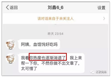 她私信江歌妈妈,内容是:阿姨,血馄饨好吃吗?我看你热度也逐渐消退了,我上来帮一下你。不然你做不出文章了,太可惜了。