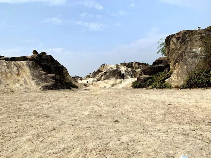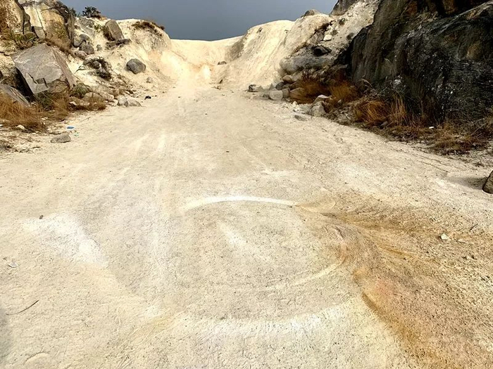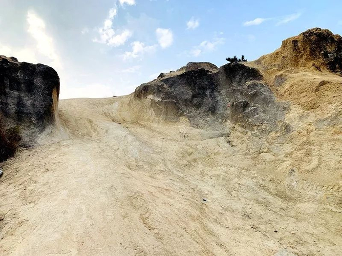 在采石场现场可以看到,是一个广阔的岩石沙地地貌,从山顶到山低,有着十几个高度不等的陡峭岩石山坡,接近山顶时,道路左右便都是上百米的悬崖峭壁。几乎每个山坡,都有轮胎齿轮压过的轨迹。
