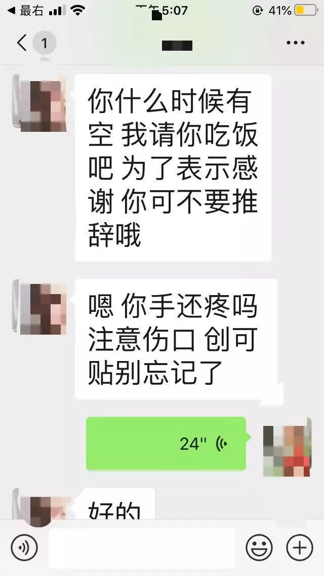 28日下午5时许,吴申元收到对方发来的一则消息:“我请你吃饭吧,为了表示感谢,你可不要推辞哦。”