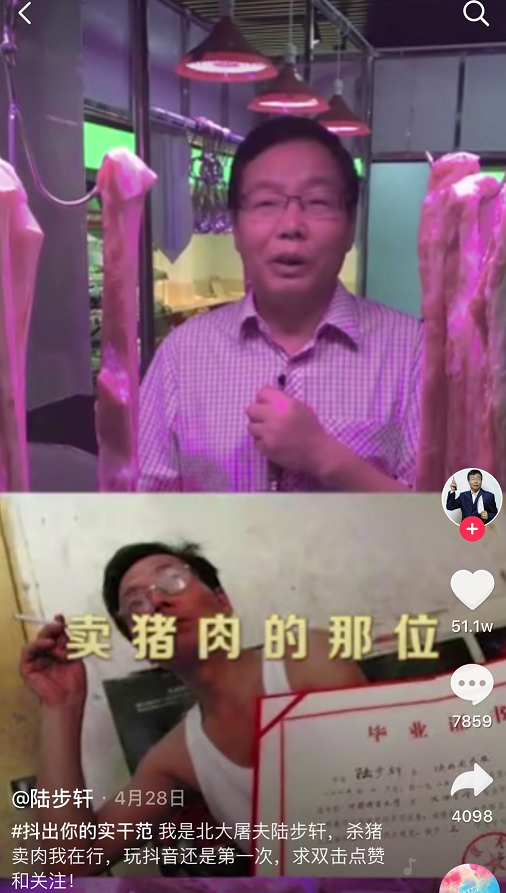 陆步轩是抖音上的“老网红”,抖音里的他讲北大、讲猪肉,也讲人生哲学。他语速不快,身上也没有其他抖音网红的娱乐气质,但数据证明观众很买单——他的第一条“出道”视频目前点赞量已达51万。