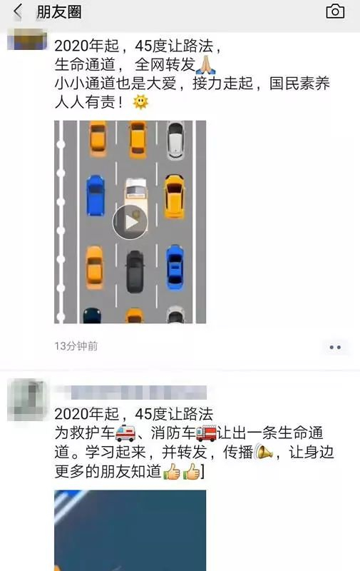 今日,朋友圈一个15秒动画视频火了。视频中,鸣着警报声的救护车被车潮包围,情况紧急。随即,两条车道上的车,同时向相反方向斜向避让45度,给救护车让出一条生命通道,使得救护车顺利通行。该视频配文:45度让路法,小小通道也是大爱。