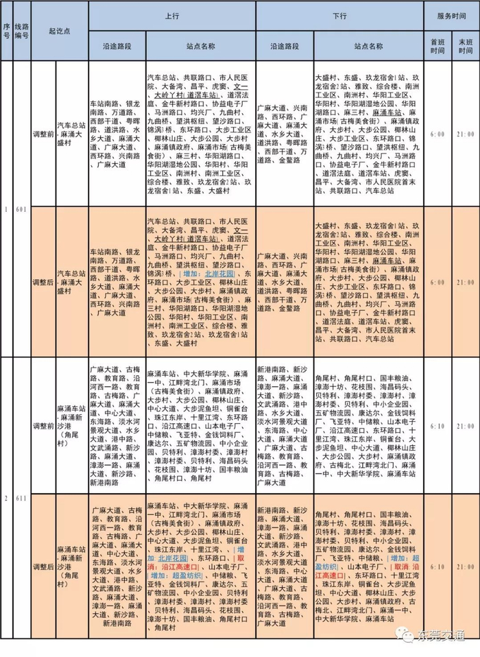 调整601路“汽车总站至麻涌大盛村”、630路“望牛墩文化广场至麻涌华阳湖 ”、631路“南城车站至麻涌车站”,上述三条线路上行增加“北岸花园”站。