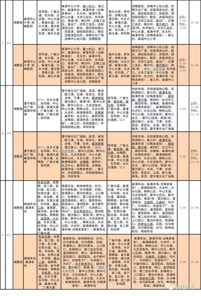 调整613路“麻涌中心小学至洪梅医院”,线路下行增加“北岸花园”站。