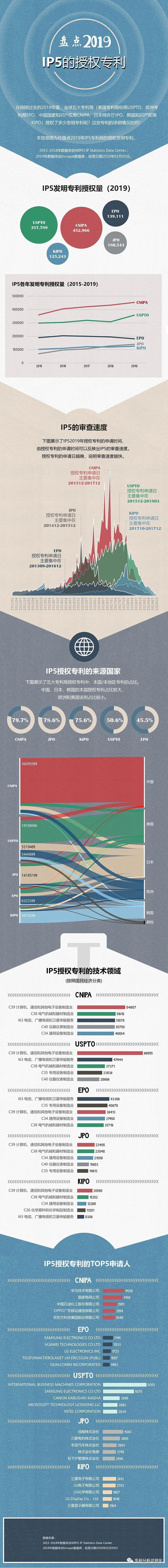 本期推送的信息图展示了IP5世界五大专利局(中国国家知识产权局CNIPA、美国专利商标局USPTO、欧洲专利局EPO、日本特许厅JPO和韩国知识产权局KIPO)在2019年授权专利的状况。