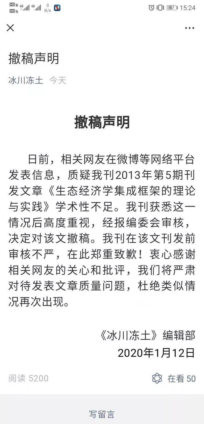 1月12日中午,《冰川冻土》官方微信公号发布《撤稿声明》称,经报编委会审核,决定对该文撤稿,并就审核不严郑重致歉。