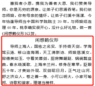 在最后,作者恐怕觉得这三五万字还不足以表达自己对导师、师娘的高山仰止之情,又用自己的“有限才华”为导师、师娘作了名为《闲想鹤仪形》的长诗一首,小编在此摘抄一两句,以飨读者: