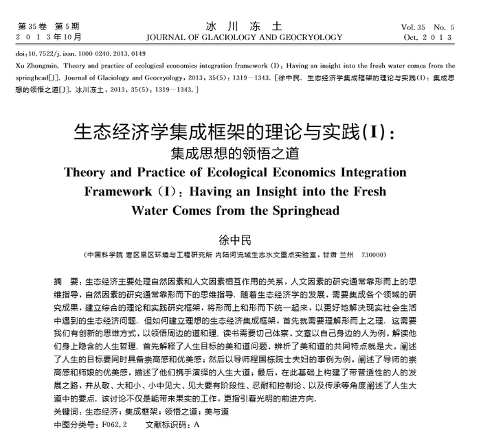 每经小编在中国知网查询到了上述这篇题为《生态经济学集成框架的理论与实践(I):集成思想的领悟之道》(以下简称《理论与实践(I)》)的论文,该论文发表于2013年第5期的《冰川冻土》期刊,作者为徐中民,时任中国科学院寒区旱区环境与工程研究所的研究员,而其文中提到的“导师”则是《冰川冻土》的主编程国栋。